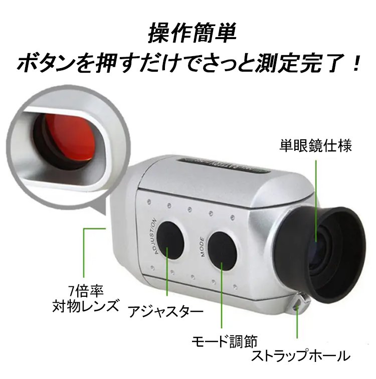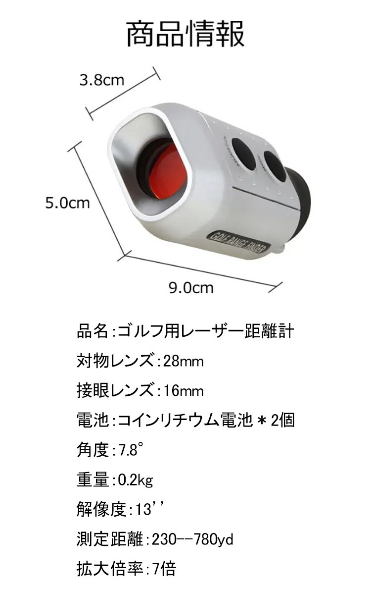 【ゴルフ用レーザー距離計】軽量 防水 7倍率拡大 自動ピンサーチ機能 充電不要